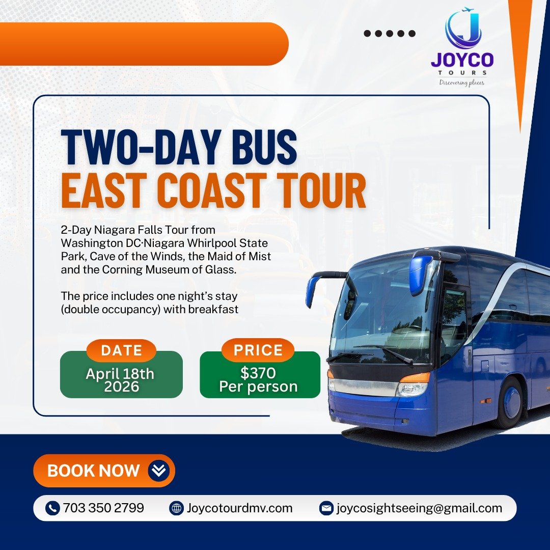 Join JoyCo Tours for an unforgettable 2-day adventure from Washington, DC to the breathtaking Niagara Falls. Experience the raw power and beauty of one of the world’s most iconic natural wonders while enjoying guided tours, scenic views, and immersive attractions.