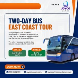 2-Day Exciting Bus Tour from Washington, DC to Niagara Falls Destination Highlights: Niagara Falls · Niagara Whirlpool State Park · Cave of the Winds · Maid of the Mist · Corning Museum of Glass Available Date: April 18 Trip Overview Join JoyCo Tours for an unforgettable 2-day adventure from Washington, DC to the breathtaking Niagara Falls. Experience the raw power and beauty of one of the world’s most iconic natural wonders while enjoying guided tours, scenic views, and immersive attractions. Marvel at the majestic force of Niagara Falls and…