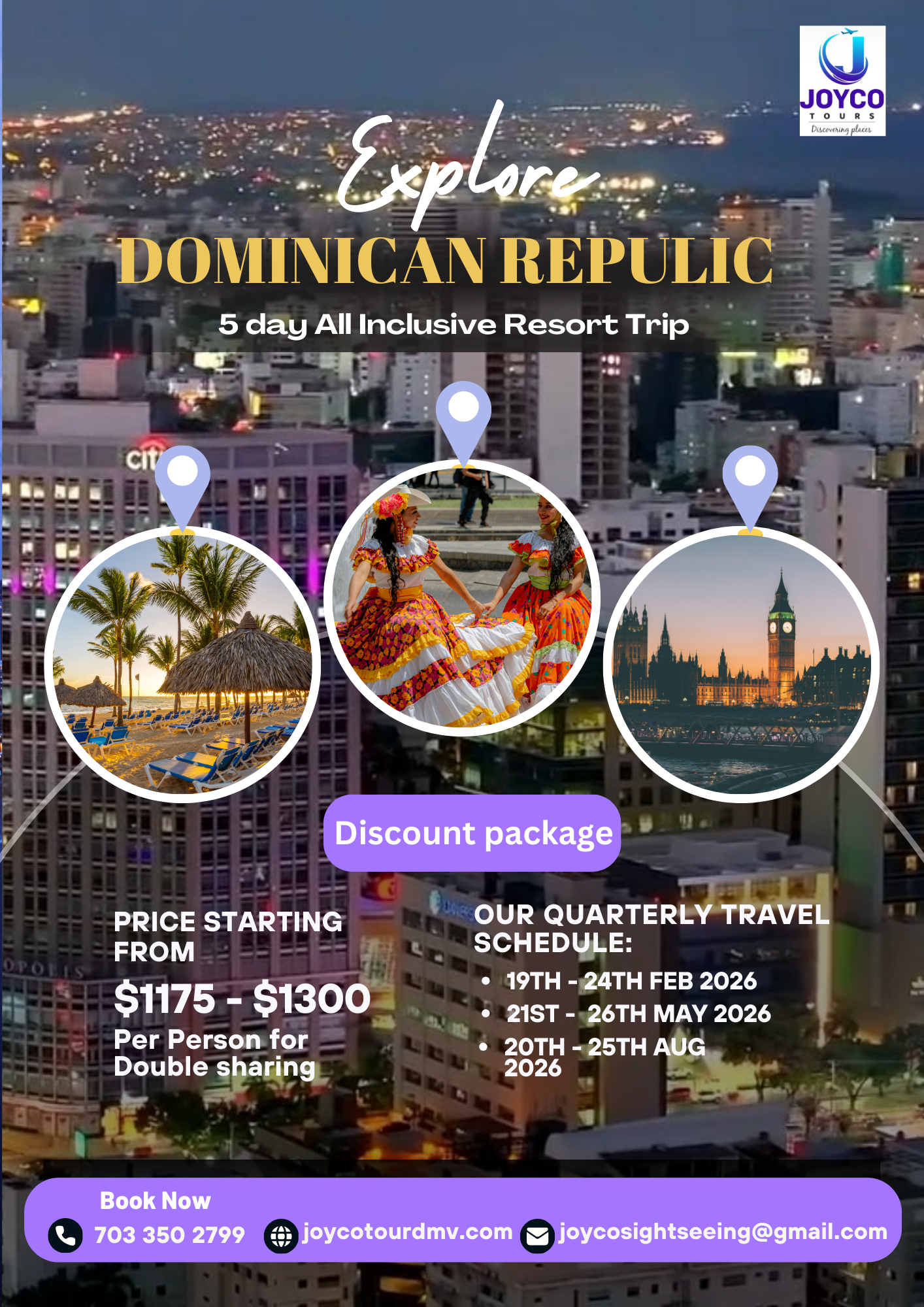 Join JoyCo Tours for an unforgettable 5-Day, 4-Night All-Inclusive Resort Experience in the Dominican Republic, one of the Caribbean’s most beautiful and vibrant destinations.