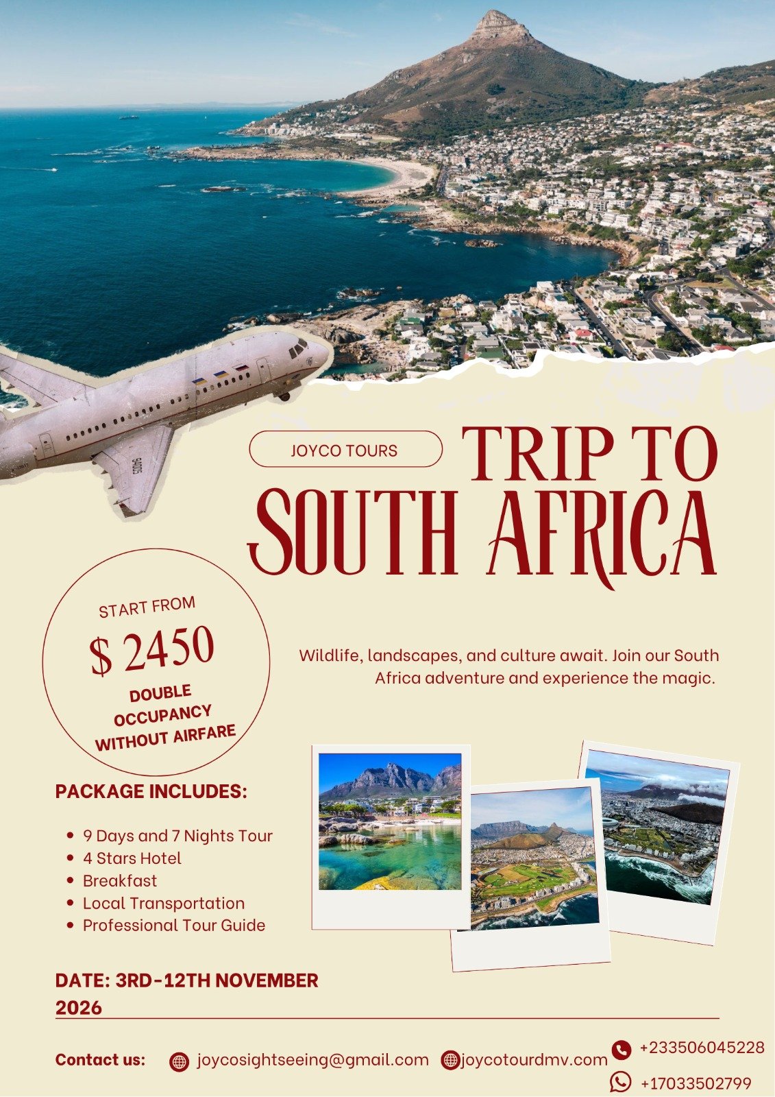 Join JoyCo Tours for an unforgettable 7–9 Day Travel & Tour Experience to South Africa, one of the most dynamic and breathtaking destinations in the world. From majestic Table Mountain to thrilling safari adventures, from the cultural heartbeat of Cape Town to the vibrant energy of Johannesburg, this trip delivers a powerful blend of exploration, learning, rest, and adventure.